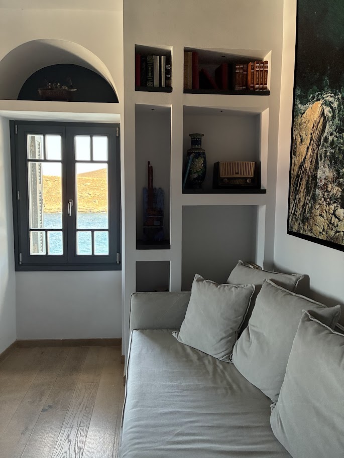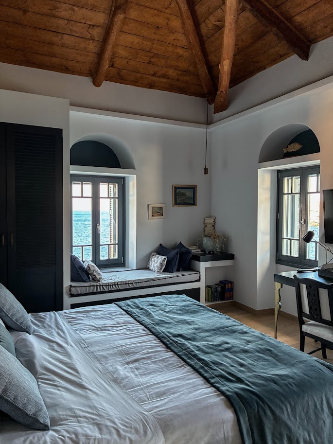 That’s why Louiza and her husband wanted to preserve it as much as possible and took on the challenge of restoring the property and sharing it with guests who, like them, enjoy this time capsule and the spectacular location with phenomenal sea views. Speaking of which, some rooms even make you feel like you’re on a ship when you look outside.