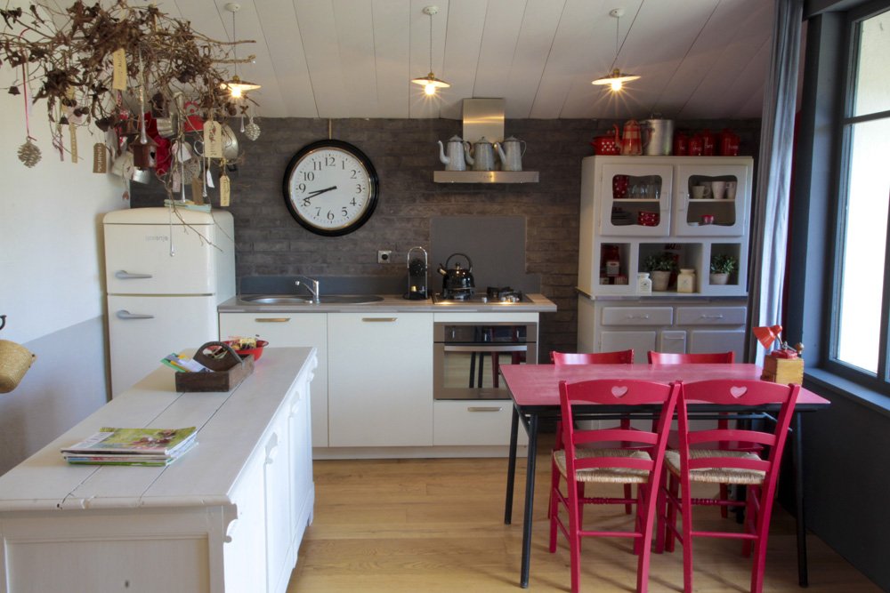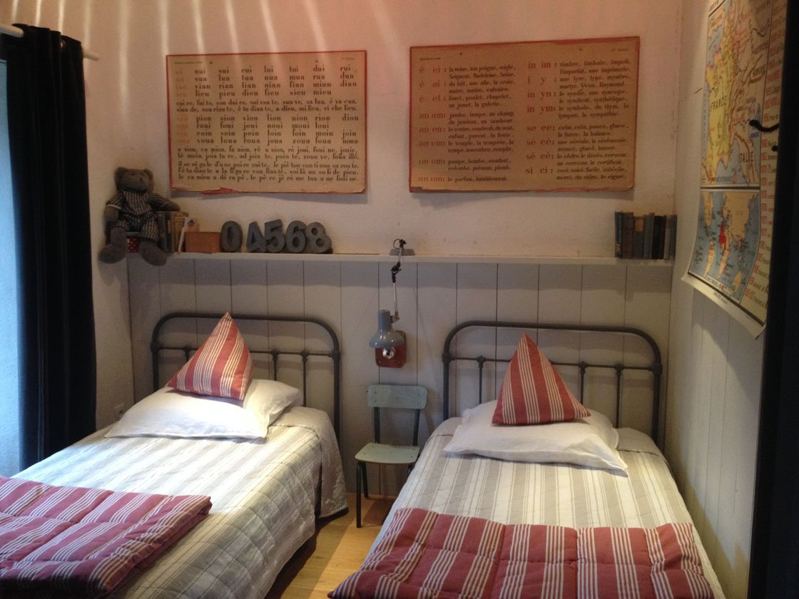 But I’m getting ahead of myself, for first we want to explore the cottages. All of them are named after their original occupants – all members of the Corentin family. No cottage is the same and they were all done up in a special theme. Liz has a wonderful sense of decoration and style….original and unique! We are staying in “La Maison de Jeanne”, which is decorated entirely in the style of an old school house. Wonderful and in no way overdone, quite the contrary. The large open plan kitchen, fully equipped and complete with washing machine, will allow you to cook for yourself and make some lovely Nespresso coffee. A lazy couch, TV and wood burning stove, with a large supply of wood provided, complete the living room. You won’t have to be cold here anywhere, for six of the seven cottages come with an ingenious, ecological floor heating system, nice and very comfortable.