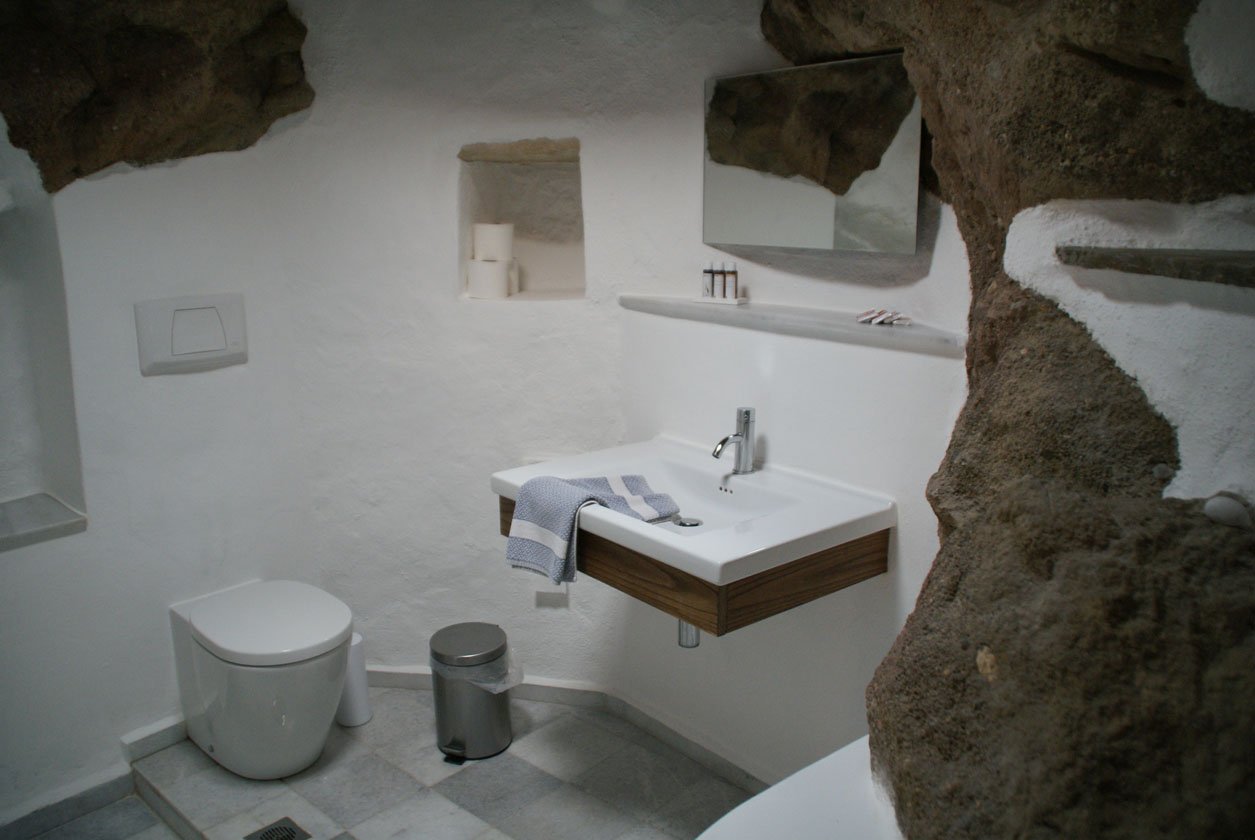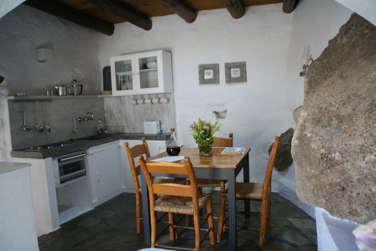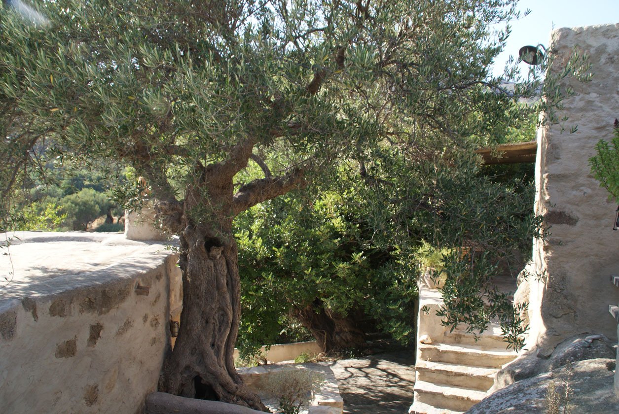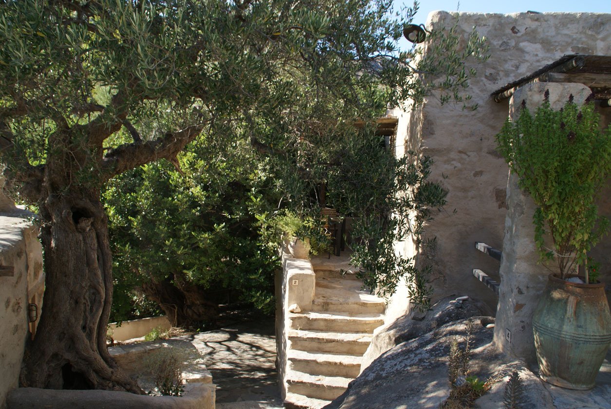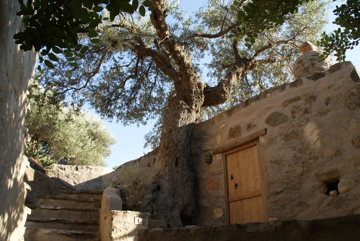 Het complex bestaat uit 12 cottages en studio’s die een organisch geheel vormen met het landschap, je vindt er bijvoorbeeld nog veel oude knoestige olijfbomen die de tand des tijds hebben doorstaan en tegen de muren van de huisjes opgroeien. Bijzonder was het om de foto’s te bekijken van voor en na de renovatie, Vangelis liet mij deze zien. Wat een werk moet het geweest zijn om uiteindelijk tot dit mooie eindresultaat te komen. De huisjes ademen allemaal een stijlvolle lokale sfeer uit en hebben allen iets eigens. De één heeft weer een iets ruimer terras, de ander zeezicht, weer een ander een ruimere badkamer. Ze zijn allen met de grootste zorg afgewerkt en van alle gemakken voorzien. Ik verbleef in de ruimste variant met een aparte slaapkamer, woonkeuken annex living, ruime moderne badkamer (met heerlijke natuurlijke douchespulletjes van het Griekse merk Korres samen met het Griekse Apivita nieuwe persoonlijke favorieten) en een beschut terras.