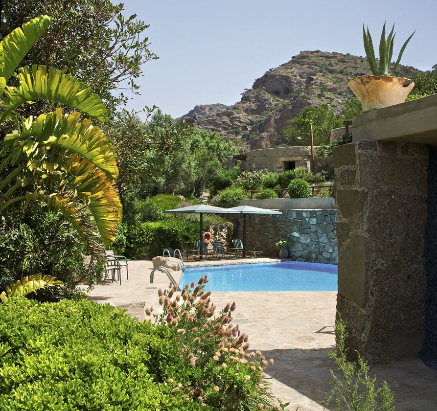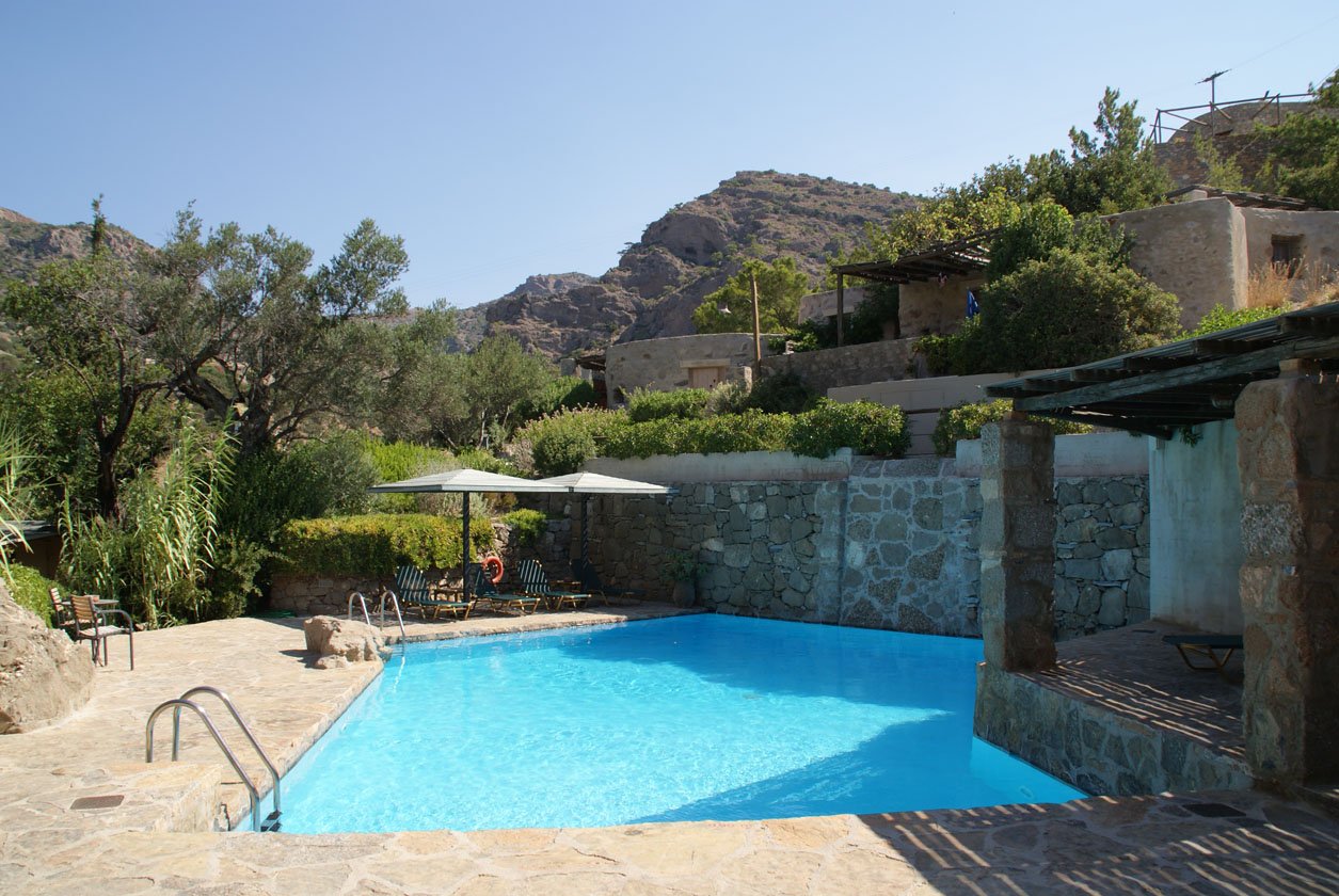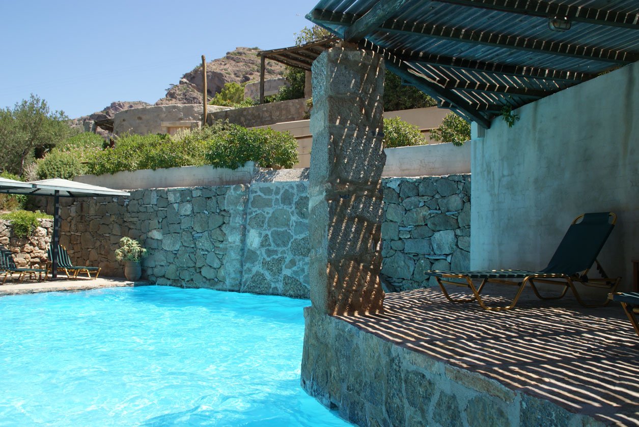 Het hart van het complex wordt gevuld door het mooie grote zwembad, Vangelis hield hiermee gelukkig ook voet bij stuk, terwijl anderen zeiden dat het afbreuk zou doen aan de omgeving vond hij een zwembad onmisbaar voor zo’n accommodatie mits zorgvuldig vormgegeven. Hij had gelijk, het is een fijne plek om in alle rust je boek te lezen en af en toe een verkoelende duik te nemen. Ook voor kinderen is het de plek om elkaar te ontmoeten en met elkaar te spelen. Deze Hideaway is een prima stek om met je kroost te verblijven al raad ik het ouders met dreumesen en peuters af i.v.m. de vele stenen trappetjes.