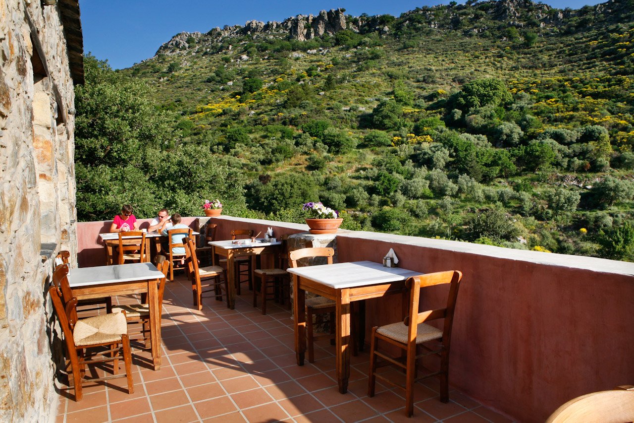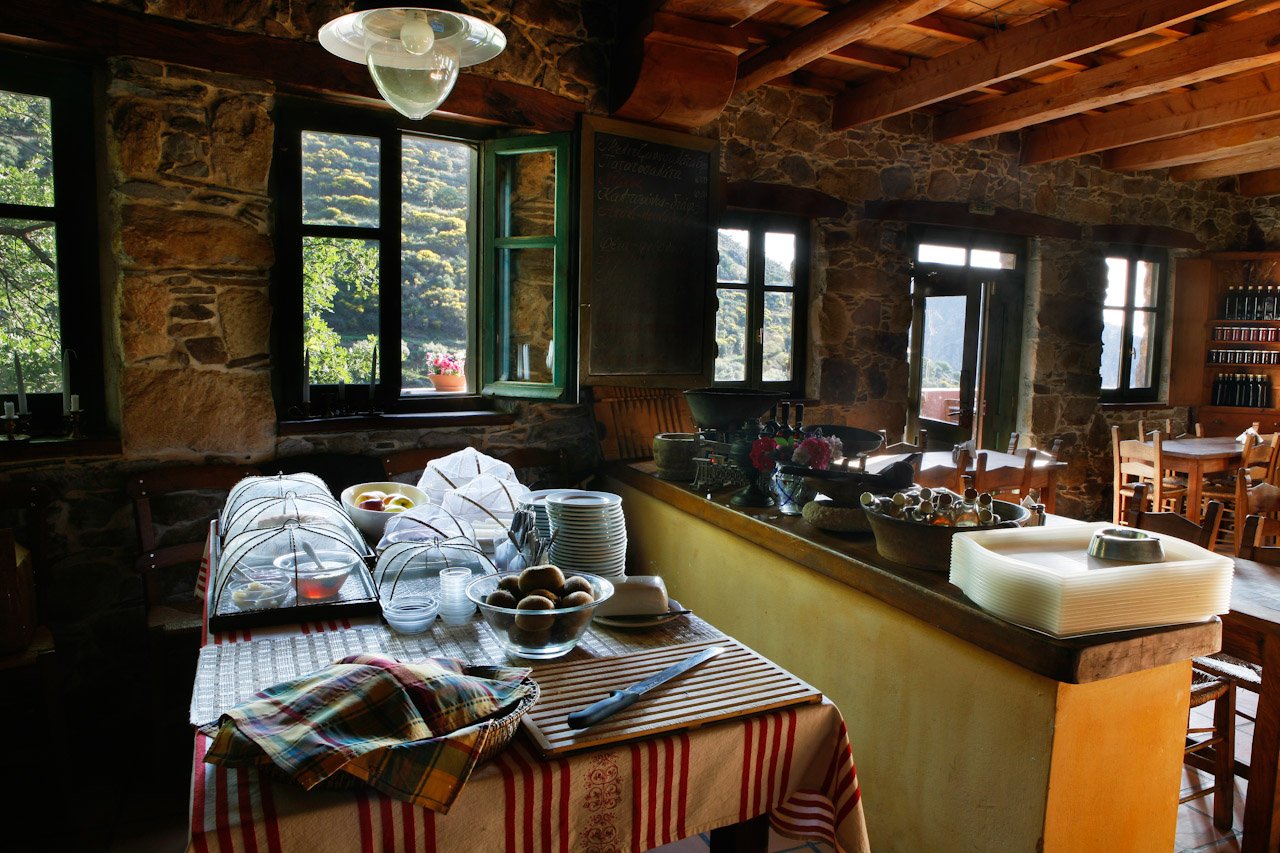 Centraal gelegen is het restaurant, tevens de receptie. Het heeft een super knus en rustiek interieur en een prachtig terras met uitzicht op de majestueuze bergen…je wordt hier letterlijk omringd door prachtige natuur. Een perfect startpunt om wandelingen te maken, er zijn er velen uitgestippeld, zorg wel voor de juiste wandeluitrusting. Maar je kan deze Hideaway ook zeer goed gebruiken als uitvalsbasis voor de mooiste stranden van het eiland, namelijk die aan de westkust. Elafonisi bijvoorbeeld, hét beroemde strand van Kreta, ligt op een klein uurtje rijden en het voordeel is dat je er in alle vroegte al kan zijn voordat de bussen uit Chania arriveren.