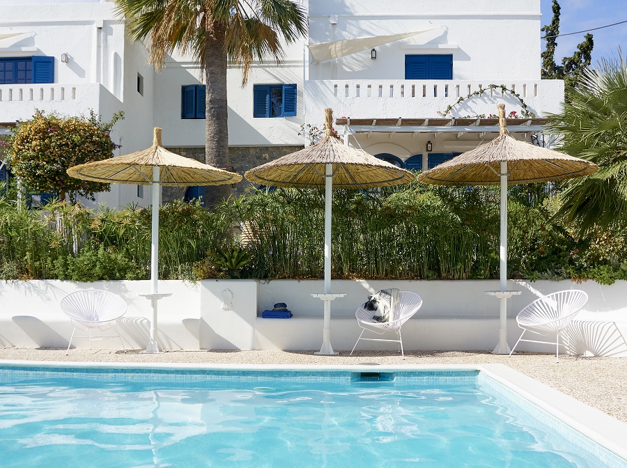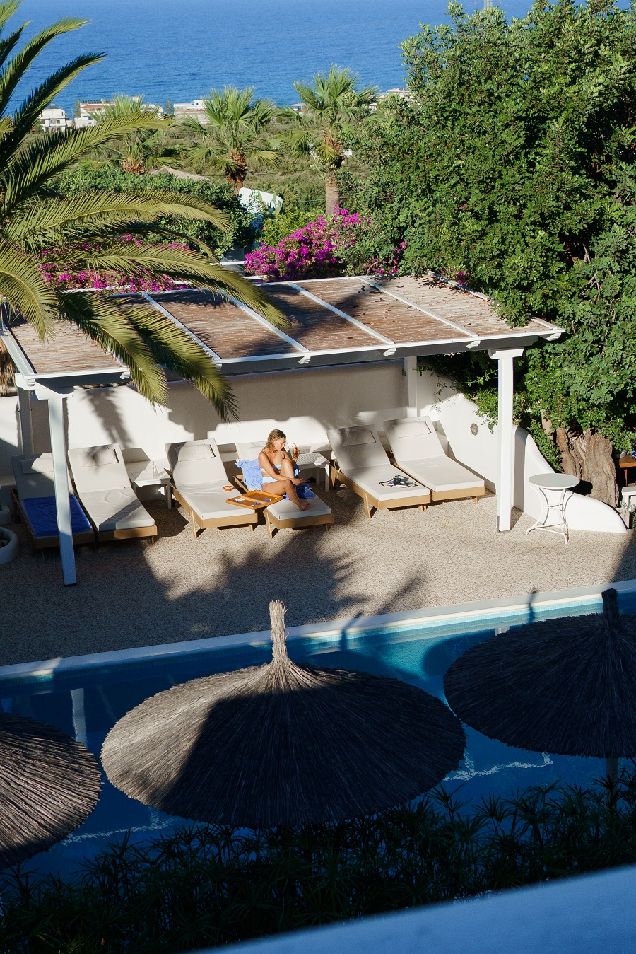 Aan de andere kant van het zwembad vindt u het hart van de plaats: de bar met een mooi terras. De plek voor het ontbijt, een verfrissende freddo-cappuccino (mijn favoriet!), Kleine (lunch) gerechten of een glas wijn. Dit is een mooi en stijlvol ontworpen gebied, waar gasten hun favoriete plekken in het gebied tegenkomen en uitwisselen. ‘S Avonds en niet in de stemming om ver naar een restaurant te gaan? Om de hoek vindt u tal van taverna’s in Koutouloufari, allemaal op loopafstand.